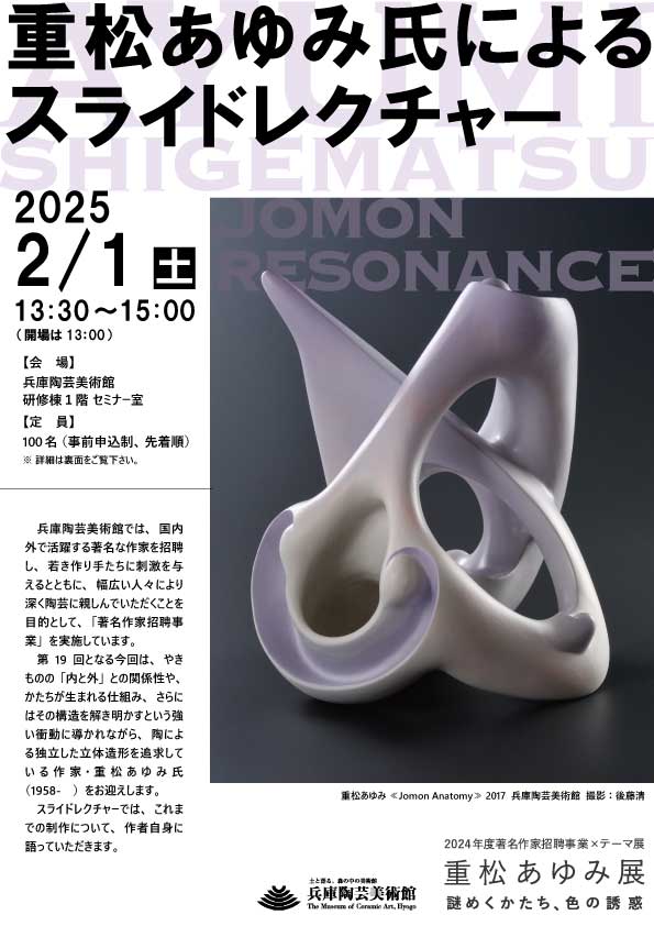 第19回となる今回は、やきものの「内と外」との関係性や、かたちが生まれる仕組み、さらにはその構造を解き明かすという強い衝動に導かれながら、陶による独立した立体造形を追求している作家・重松あゆみ氏(1958- )をお迎えします。